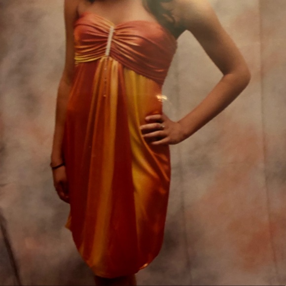 Red, orange, & yellow (sunset gradient) Knee length Strapless Wore once Silver sequence Orange shawl included