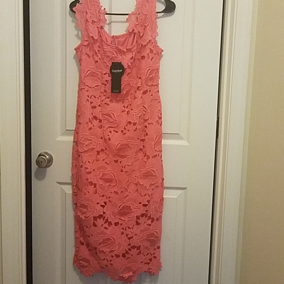 3D Lace dress sleeveless silk lining to the thigh dress comes down past knees..split in back new with tags run very small says XL but really like 8..zips in back...figure fitting new with tags but not original packaging.. Never worn