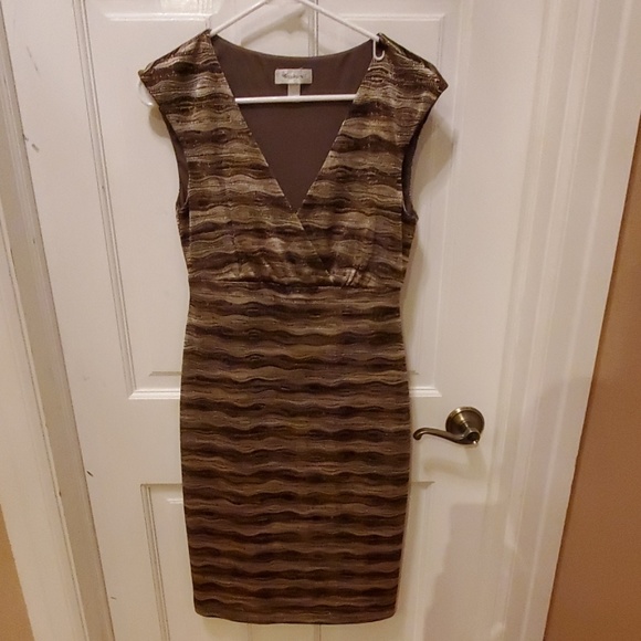 Below the knee fitted high waist low cut dress with gold shimmer