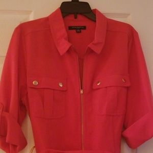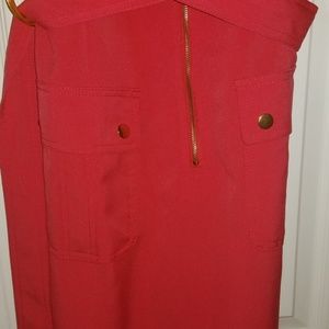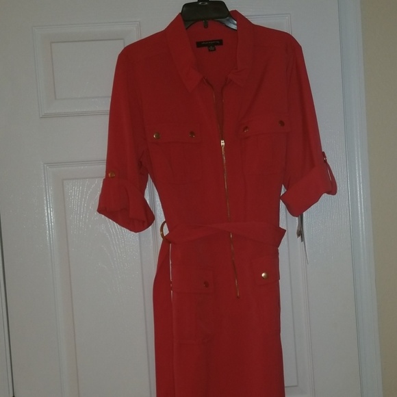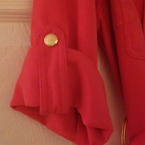 A coral dress with cute pocket designs and a belt. Gold accents.