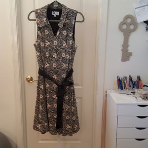 Ecru on black knit lace fit and flare. IFully lined. Side zipper with overhead on/off. Ribbon self tie belt. Armpit to armpit is 21 inches. 40.5 in length. Never worn.