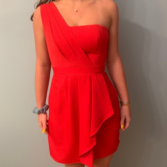 Short, tight red dress with one sleeve and ruffle detailing. In great condition, only worn once.