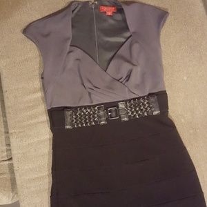 Form fitting size 6 gray and black dress with a belt. I wore this dress twice and it has been dry cleaned.