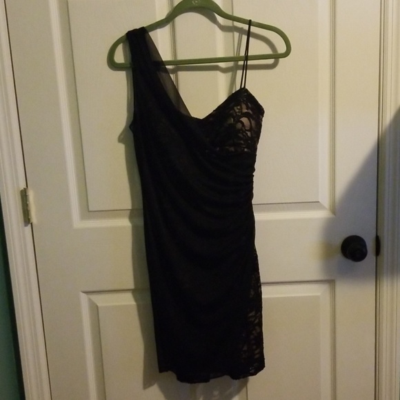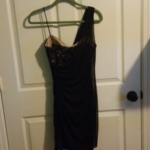 Black and nude dress. Sheer black fabric over black lace and sequins, nude slip underneath, juniors size 9/10.