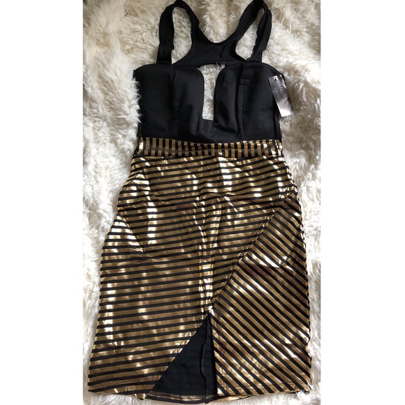 Dress runs small. It’s a very cute low cut dress has a little cutout to show some extra leg. Zippered back, nice metallic stripes throughout skirt. 💋
