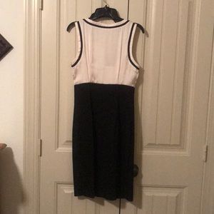 Cream and black ruffled dress trimmed with black piping