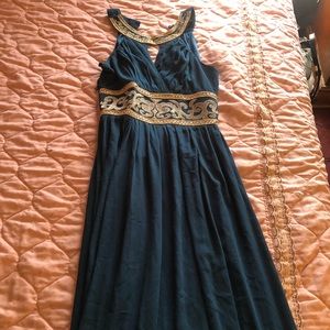 A beautiful emerald green dress with a exotic look to the chest