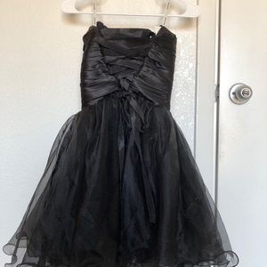 The dress is strapless, all black with silver rhinestones, lace up back with a zipper below the tie, and an elastic clasp that goes around the back to help hold it in place.