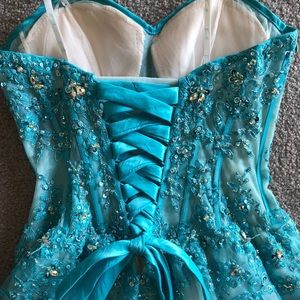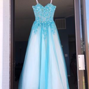 The dress was only worn once for a quinceañera in 2014 and has been stored in a bag, hanging in a closet. There is no yellow discoloring on any of the white portions of the gown however the bottom of the inside layer on the dress is a little dirty but it’s not visible when wearing the dress.