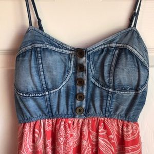 High low dress. Bodice has denim looking material as well as five buttons for decoration. Skirt half has coral paisley designs. In good condition.