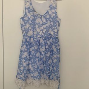 Light blue and white patterned dress with beautiful lace bottom. Slightly dipped back. {Mom wore it once} Perfect dress for a wedding!