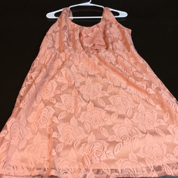 Peach colored dress with ruffle on front and loops for a belt if desired.