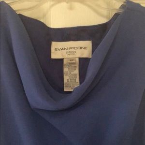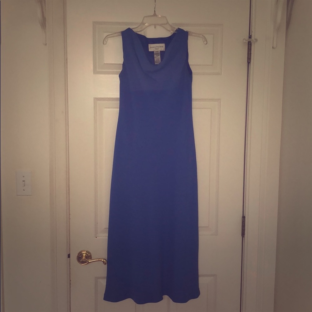 Beautiful periwinkle blue color, long dress with draped neck. Length could be just below knees or just above ankle depending on your height. Either way, very flattering. Size 4P which is comparable to a regular size 0-2 for this dress. Worn once.