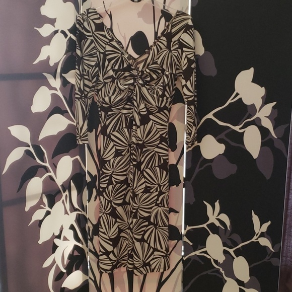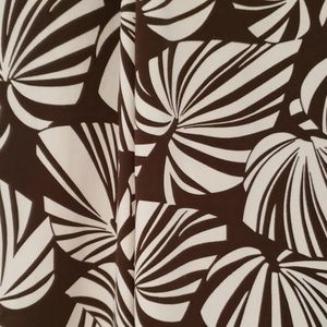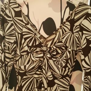 Chocolate brown dress with cream leaf print. Scrunched top with mid length sleeves.