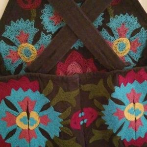 Roja XS navy dress with Mexican embroidery. Length is below knee, fabric is cotton, straps can criss-cross or can be worn staright - the 'sleeves' unbutton. Should be worn without a bra and offers grest support...I am a 32 DD.