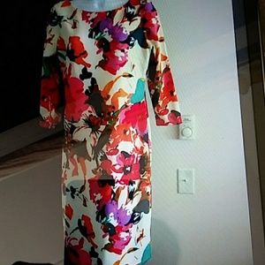 Pre owned women 3/4 sleeves. floral multi colors dress with side zipper. Measures approx. 40". Excellent Condition. Smoke/pet free Cute and Sexy