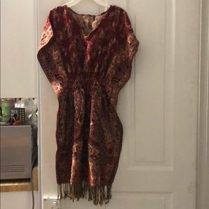 Scarf dress with beautiful pattern sewn in. Large area (but comfortable) of elastic at waist. No zippers or buttons.