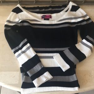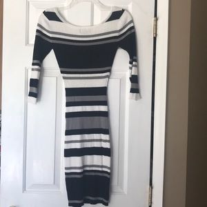 This nice black/white/ gray dress has quarter sleeves. 80 percent rayon and 20 percent polyester. Size small and in great condition!