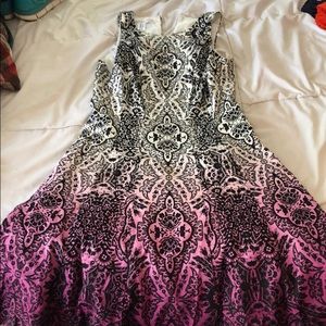 Ombré Fusia to white. Black patterns. Pockets on the front. Fluffy tool on inside.