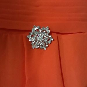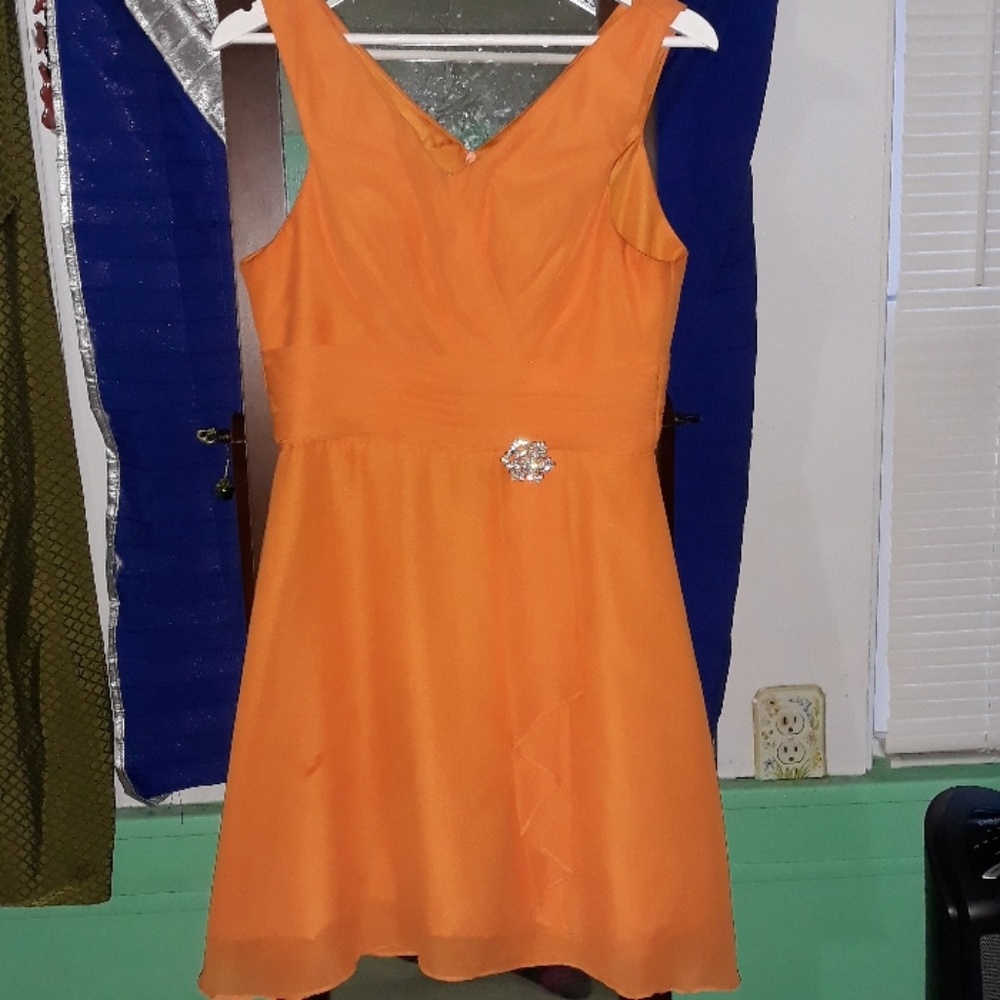 Orange chiffon dress, short, v-neck(altered), diamond flower pendant.