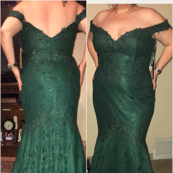 Beautiful long off the shoulder emerald lace dress with train.