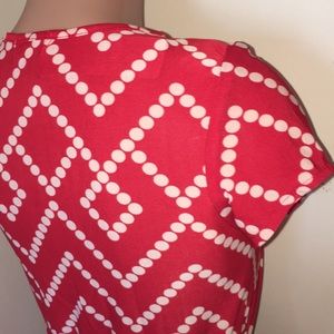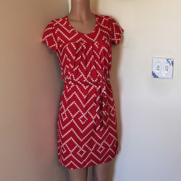 Short sleeve summer dress, can wear with blazer for work. Rounded neckline, belt that can be removed (toed in front or back).
