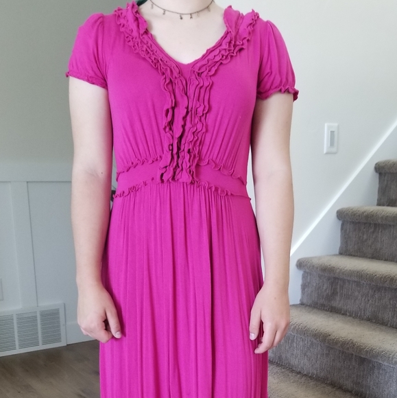 Fun pink dress with ruffles. Lightweight and flowing. Like new, no holes or stains, only worn 4 times. Hits mid calf.