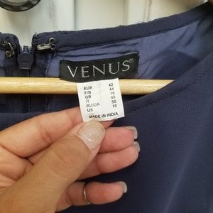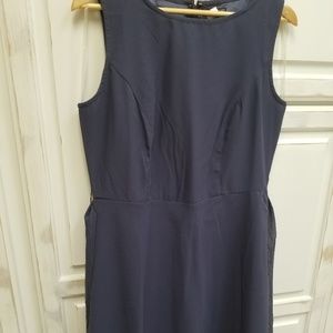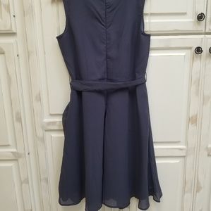 This is a navy blue, knee length dress with a removable tie belt. Dressy enough for a formal event, to a day at work. Never worn, but there's no tags. Armpit to him 31", shoulder to him 39", and armpit to armpit is 17".