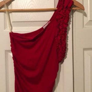 Form fitting off one shoulder dress.