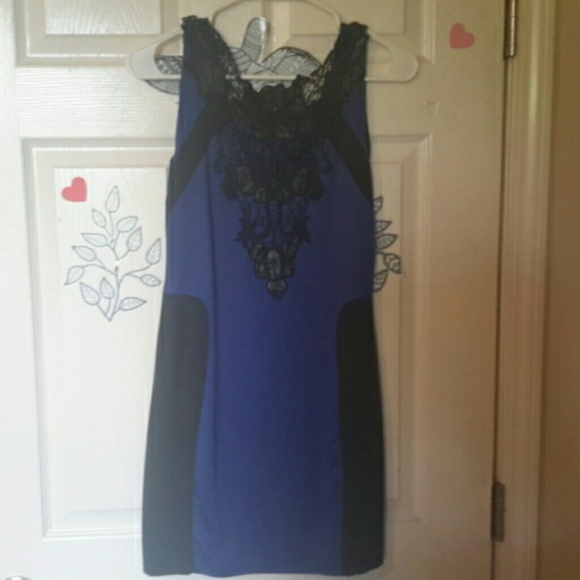 Blue and black fitted dress with flower detail on the neckline