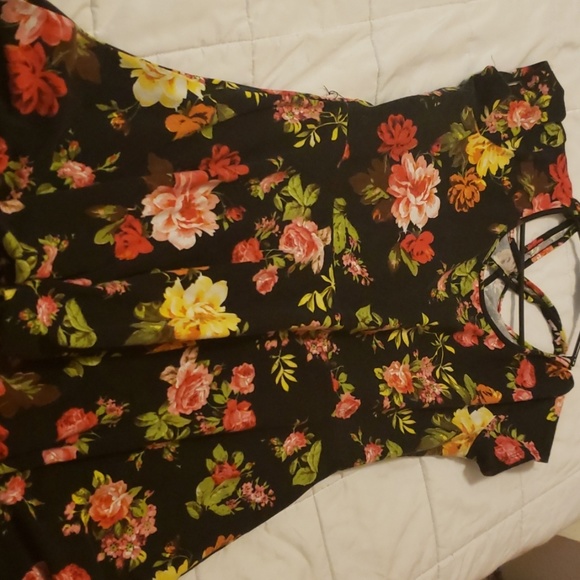 Black background, flowers on it, and "x on the back. Shows some of your back.