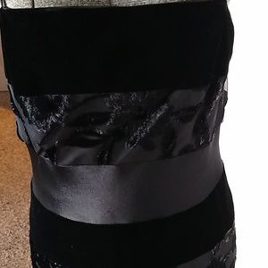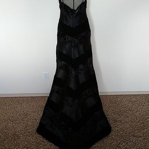 Stunning black evening gown. Black silky material with velvet patches. Long train for extra drama. Only wore once.