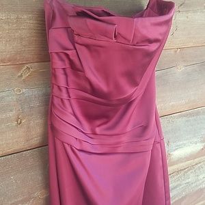 Merlot colored strapless formal dress. The gathering on the torso is flattering. It hits above the knee and has a slit in the back. There are two tiny snags that are not noticeable but you can see them up close in the last two pictures.
