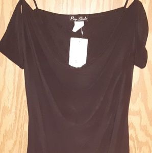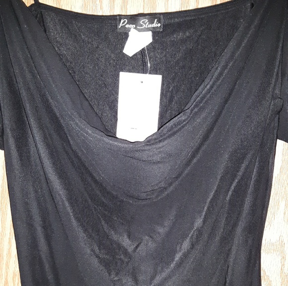 Jet black, spaghetti straps and cold shoulder sleeve, 19" from armpit to armpit, 33" from top of the back to bottom, droop front, very stretchy, NEW