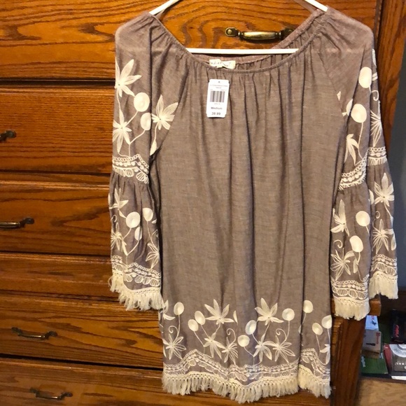 Brown dress, with flower designs and fringe on the sleeves and at the bottom