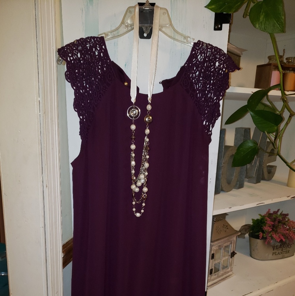 Wine colored dress like new. Comes right above the knee. Gorgeous keyhole back with a gold pearl pearl button. Lace detailed sleeves. Also included is the matching ribbon and bead necklace/earring set. Worn ONCE!