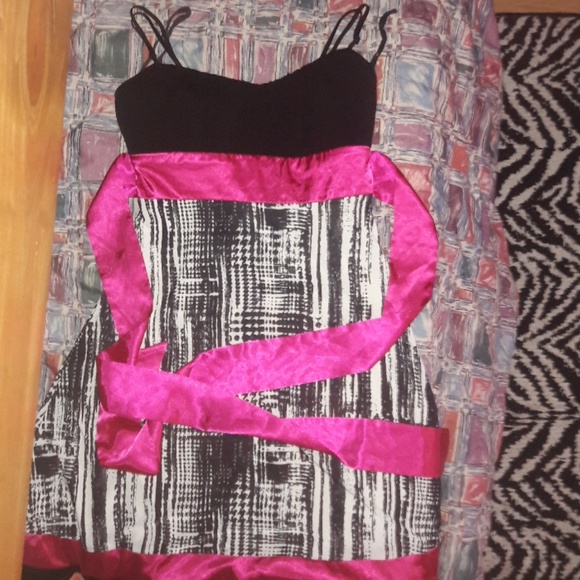 Silck material dress, black and white pattern dres, with a pink material at the bottom and top
