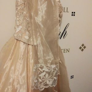 Gold and cream formal dress very elegant and very beautiful. Top portion is an embroidery gold and cream with rosette straps. The bottom is gold sheer chiffon with linning and slip with matching scarf