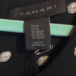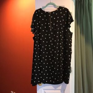 Black poke-dot matter black dress with white dots. Never worn. Very flattering. Designer Tahari. Machine washable.