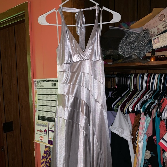 Halter, open back, above the knee