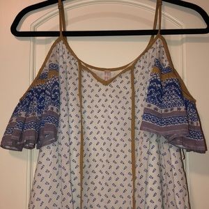 Blue, white, purple, and yellow (mustard) Free people dress. Has alarm cut outs. Worn a few times.