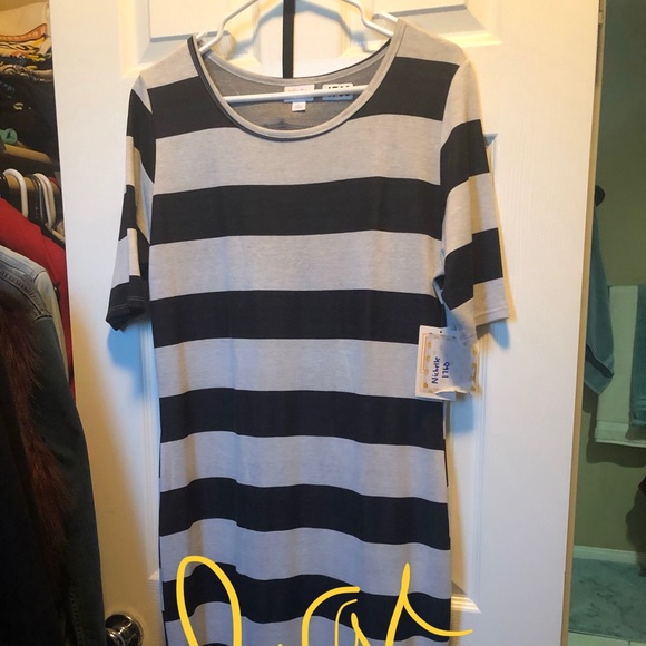 Grey and black striped dress, mid calf length. Super soft and 3/4 sleeves
