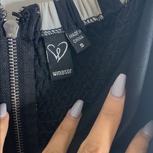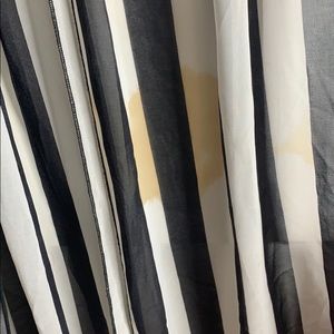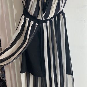 Flowy dress. Strapless. It does have a coffee stain on the very bottom below the knee in the back. Never washed only been worn ones. Last picture I pined it going across because I liked it more