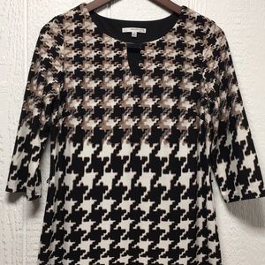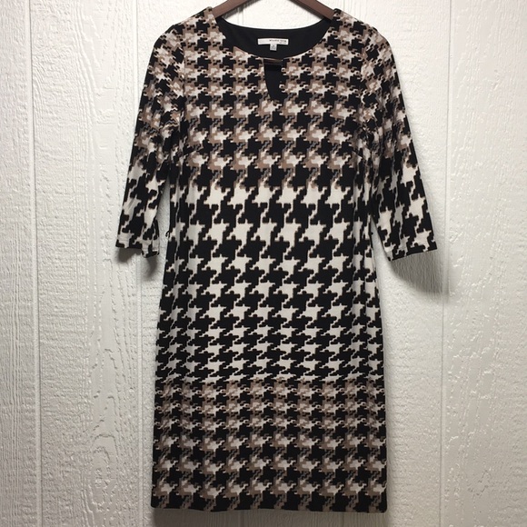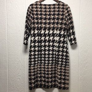 EUC (worn one time), fully lined dress, poly/spandex blend, sewn-in belt loops (no belt). Three-quarter length sleeves. Length measures 36 1/2”. Underarm to underarm measures 18”. Smoke-Free home. Offers and bundles encouraged. (Bin D)