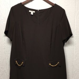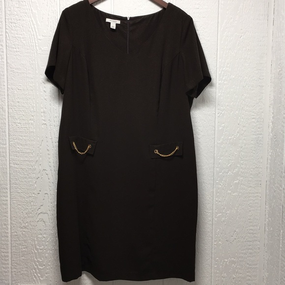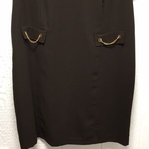 EUC, fully lined shift dress with sleeves and a slit v-neck. Zipper and walking slit in back. Non-functioning pockets with gold chain embellishments. 100% poly. Length measures 39”. Underarm to underarm measures 23 3/4”. Smoke-free home. Offers and bundles encouraged.