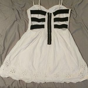 Mid thigh length, white Charlotte Russe dress. Has flower pattern on the bottom of the dress. Black stretchy back straps.