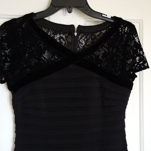 Velvet lace on top with pleated sheath, 95% polyester, 5% spandex, dry clean only