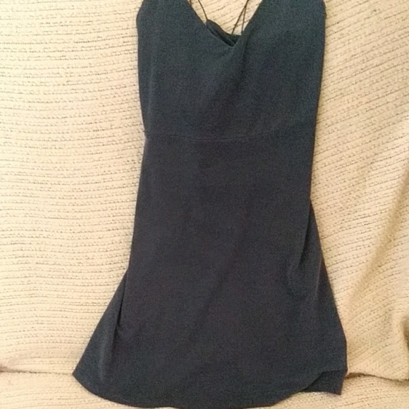 Black flowy dress. It has strings for straps and an open back and is low cut in the front.