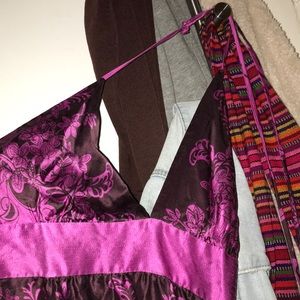 Suuuuper pretty satin purple dress with black flower designs with zipper on side and elastic on back