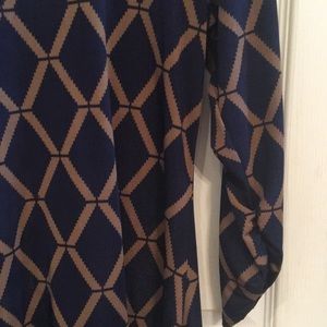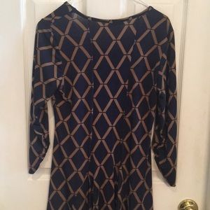 Pretty young thing dress with geometric design size L. 18” pit to pit; 34” shoulder to hem. Stretch fabric. Navy with gold. Worn only once